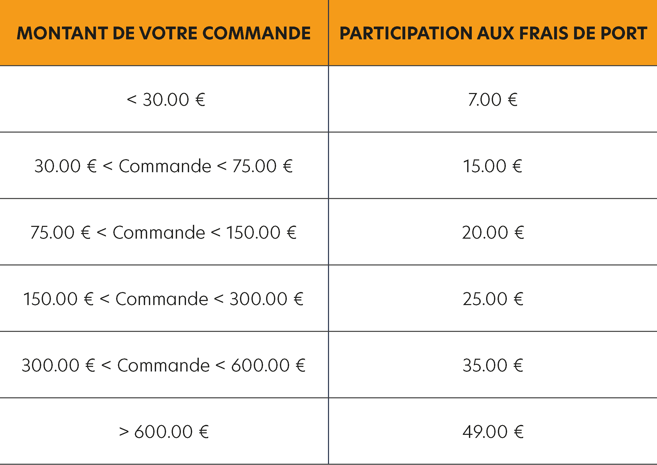 Pour toute commande ou devis effectués sur notre site internet ou par un autre moyen avec une adresse de livraison en France métropolitaine et Corse (sauf exceptions mentionnées plus bas*), le barème de frais de port suivant s'applique :