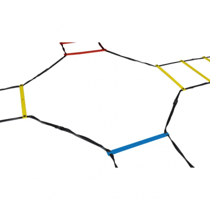 Ensemble de 4 échelles de vélocité simples de 4 m (2 jaunes, 1 bleue et 1 rouge), permettant la création d’une configuration en croix (~10 x 10 m) pour diversifier les exercices de motricité et d’agilité.